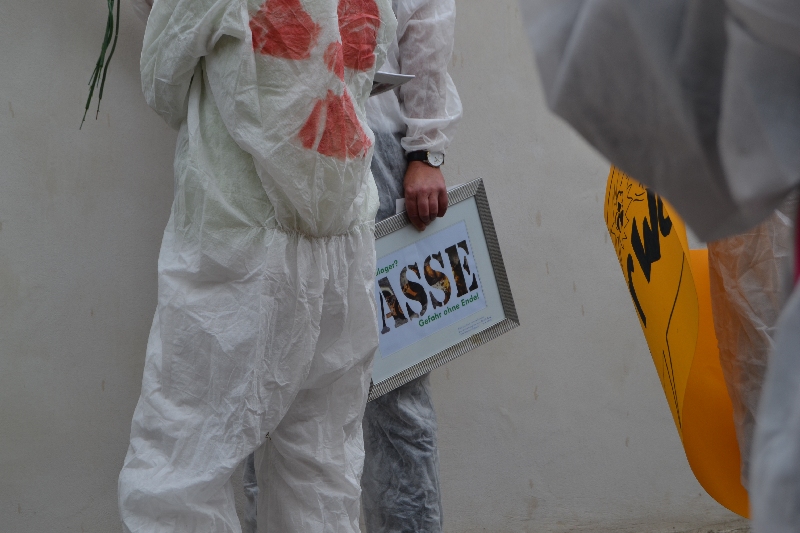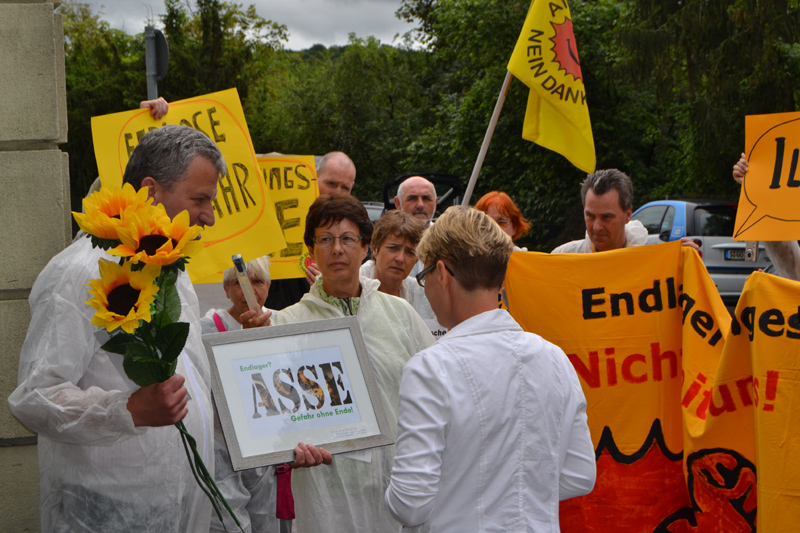 Die AKW-Gegner/innen überbrachten Einzugsgeschenke (Motto "Endlager? Unendliche Gefährdung!"), und erinnerten erneut an die Tatsache, dass es in Wahrheit nie ein sicheres Endlager geben kann.