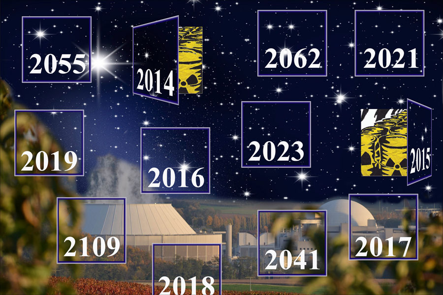 Auch in diesem Jahr laden wir Euch herzlich zu einem atomaren Jahresrück- und Ausblick direkt am Atomkraftwerk Neckarwestheim ein. Das Jahr 2014 war geprägt durch den ungelösten Streit über den weiteren Umgang mit den Unmengen an Atommüll und die vollkommen ungeklärte Frage seiner weiteren langfristigen Lagerung. Dazu kommt der Abriss-Atommüll aus Obrigheim, Philippsburg und Neckarwestheim. Geplante Castor-Transporte sollen eine Entsorgung suggerieren, stellen aber nur ein zusätzliches Risiko dar. Derweil kommt die Energiewende in Baden-Württemberg nicht in die Gänge. Beschlossene Änderungen im EEG-Gesetz behindern den Ausbau der Erneuerbaren Energien. Herzliche Einladung!