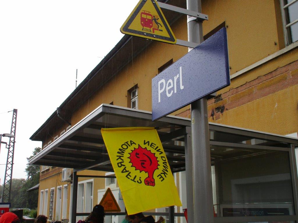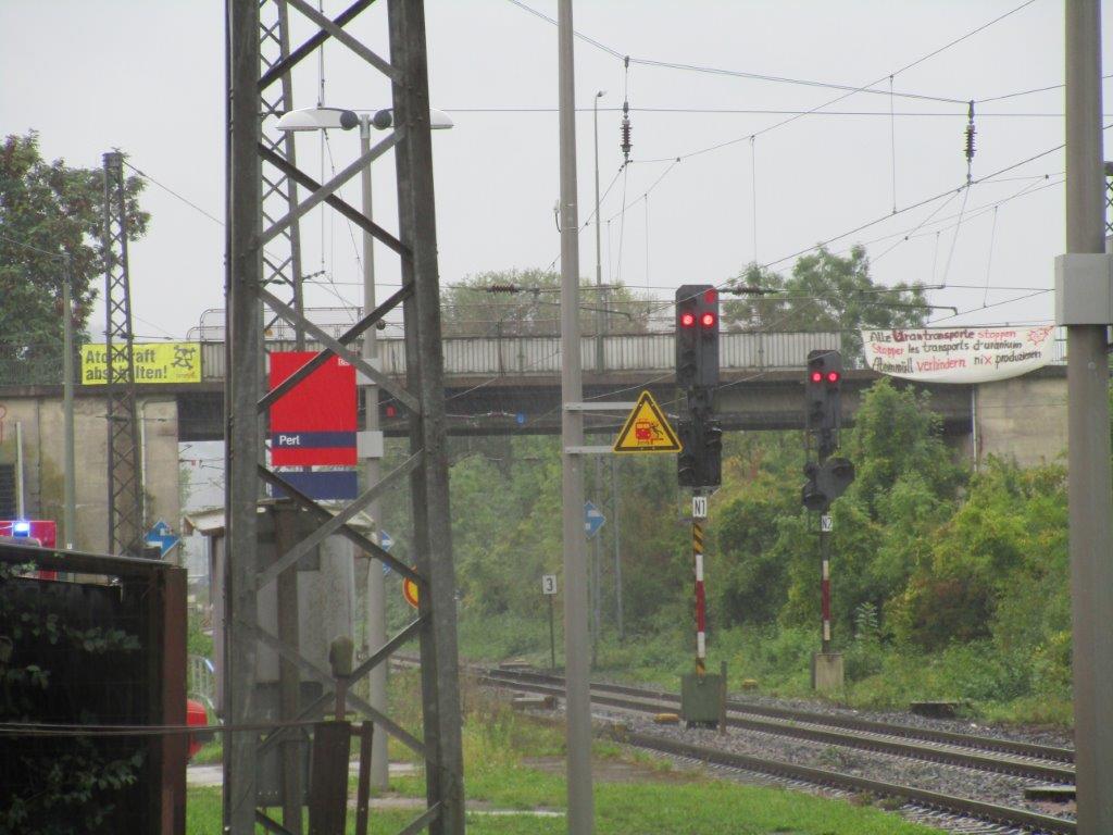 b_215_215_16777215_0_0_images_stories_akt15_150914-perl-uran_150916-urantransporte-perl_002.jpgIm Rahmen der "Aktionstage gegen Urantransporte" forderten heute am Bahnhof Perl deutsche und französische AKW-GegnerInnen den Stopp der „Uran-Geheimtransporte" und den weltweiten und sofortiger Atomausstieg. Konkret richteten sich die Proteste gegen einen Uranerzkonzentrat-Transport von Hamburg nach Narbonne, der am Dienstag in Hamburg gestartet war und laut Fahrplan heute um die Mittagszeit die Grenze bei Perl überqueren sollte.