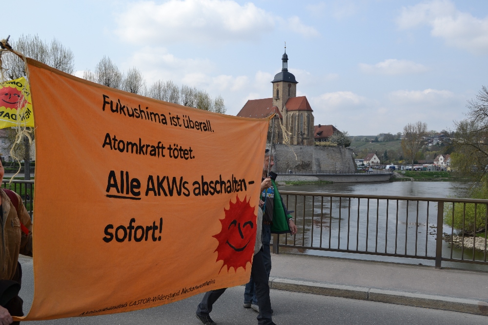 Aus gegebenem Anlass lud das Aktionsbündnis CASTOR-Widerstand Neckarwestheim zum April-Sonntagsspaziergang nach Lauffen am Neckar ein. Dort sollen demnächst nach dem Willen der EnBW fünf Mal die Castor-Schiffe aus Obrigheim die enge Fluss- bzw. Kanalschleife und die Schleuse im Ort passieren. Nach dem Auftakt mit Infostand, Austausch und Kaffee & Kuchen am Bahnhof, ging es gut bewacht von Polizei und Ordnungsamt durch die Lauffener Altstadt ans Neckarufer. Im Kundgebungsbeitrag konnten die ca. 40 Teilnehmenden dann aktuelle Informationen zur Situation in Fukushima erhalten sowie den Stand der Dinge bezüglich der Castor-Transporte erfahren.