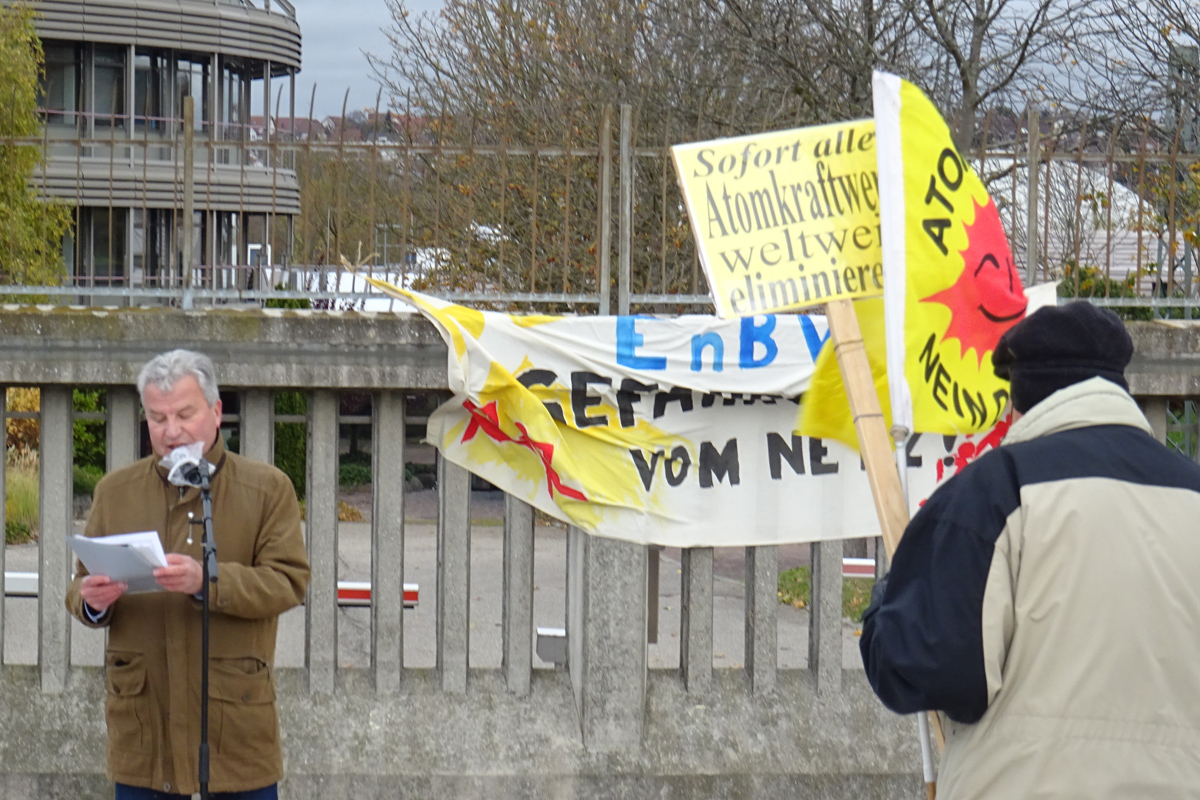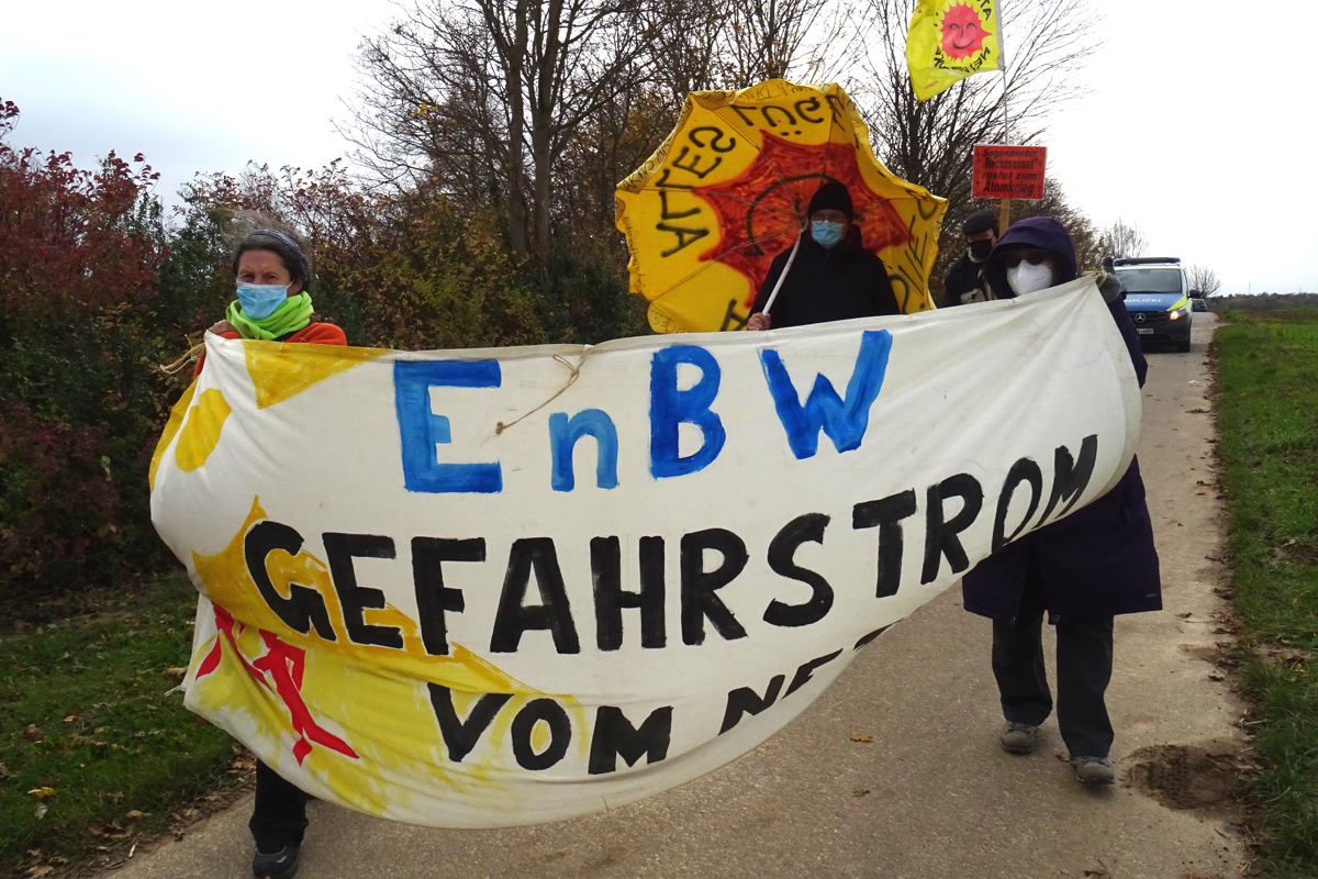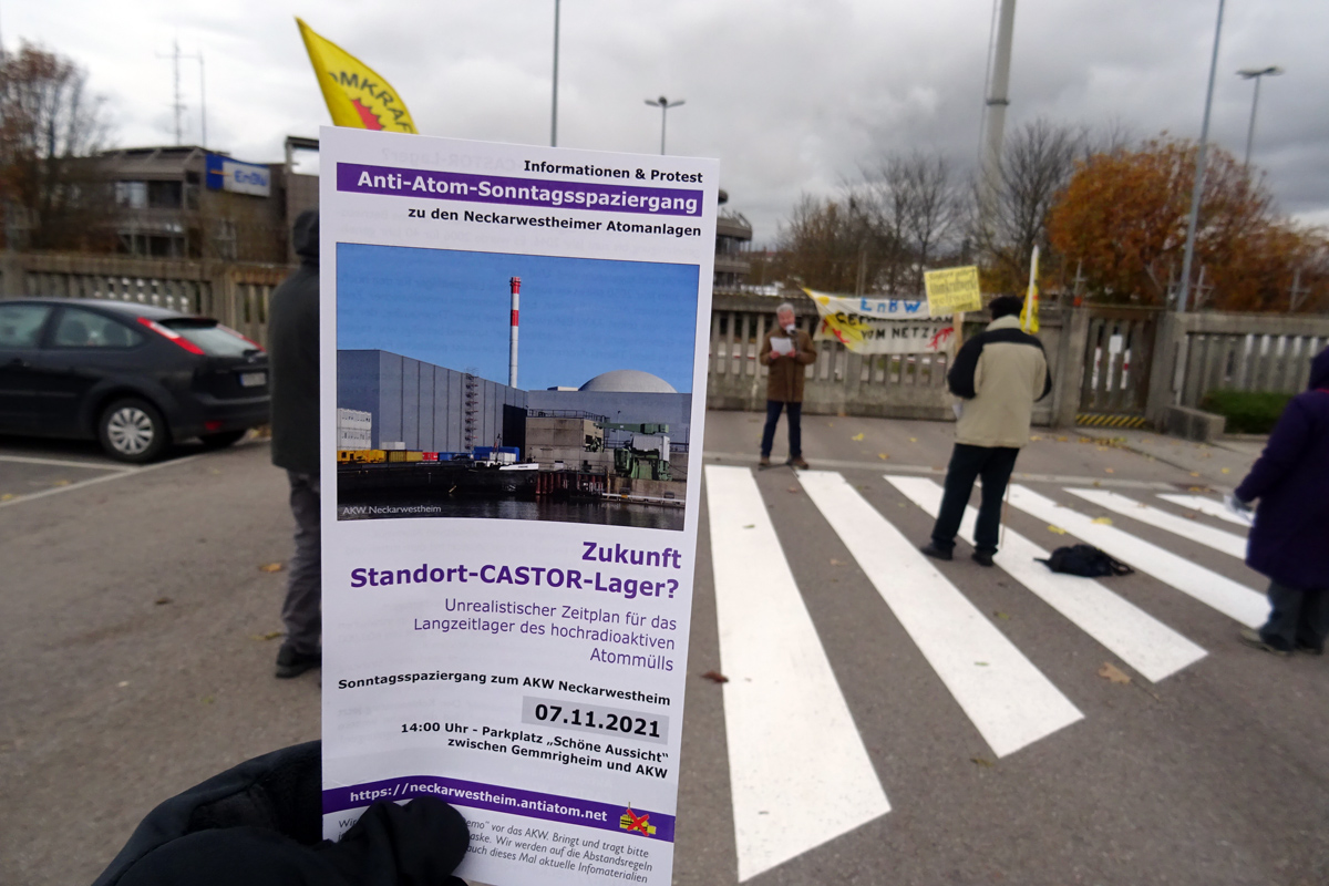 b_215_215_16777215_0_0_images_stories_akt21_211107-sonntagspaziergang_211107-sonntagsspaziergang-neckarwestheim-03.JPGSeit 50 Jahren werden aus politischen Gründen nur Scheinlösungen im Umgang mit der tödlichen Strahlung des Atommülls aus den AKW und den Atomfabriken praktiziert. Dies, damit das hoch subventionierte Atomprogramm weiter geführt werden konnte und die Energiekonzerne über Jahrzehnte mit ihrem gesundheitsgefährdendem Atomstrom tausende von Milliarden Euro verdienen konnten. Beim Sonntagsspaziergang informierten wir über den ungelösten Stand der Dinge bezüglich der inzwischen bundesweit ca. 2000 CASTOR-Behälter und 600.000 Kubikmeter schwach- und mittelradioaktiven Atommüll. Und es wurde deutlich, was die EnBW meint, wenn sie von der "grünen Wiese" spricht....