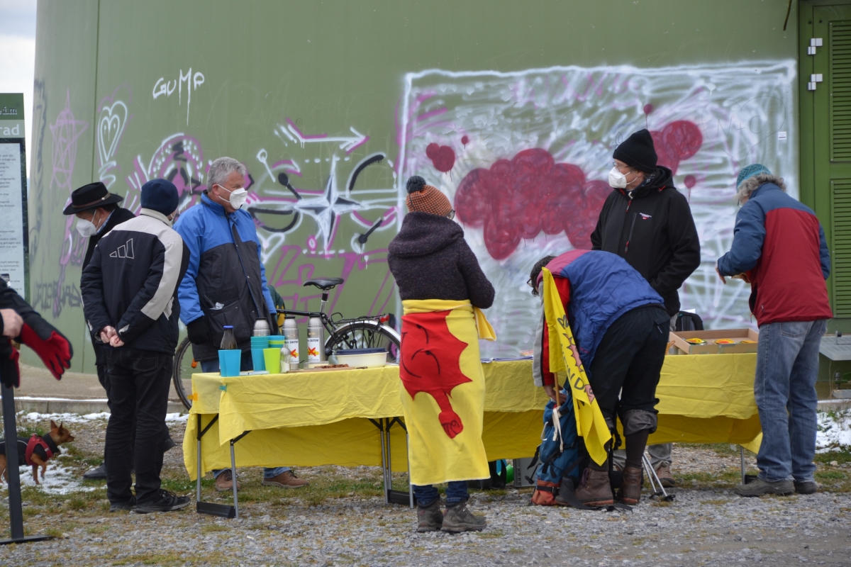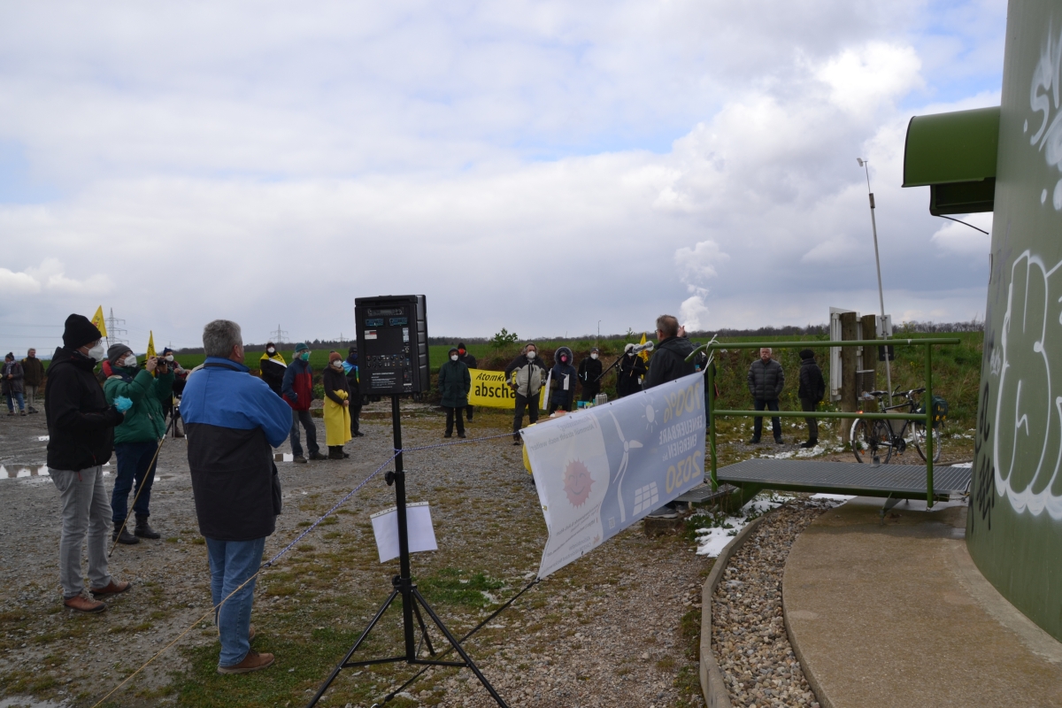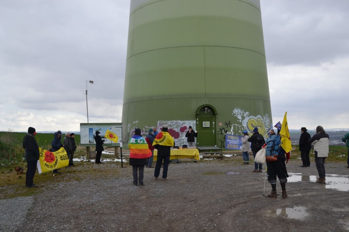 Der April-Sonntagsspaziergang fand als Kundgebung mit mehr als 30 Teilnehmenden direkt am Windrad in Ingersheim statt. Dieter Hallmann, Vorstand der Energiegenossenschaft Ingersheim, stellte das Windrad Ingersheim in einem ausführlichen Redebeitrag vor: wann wurde die Genossenschaft gegründet, das Windrad errichtet, wie war und ist die Akzeptanz im Ort, wieviel Strom produziert es jährlich usw.?