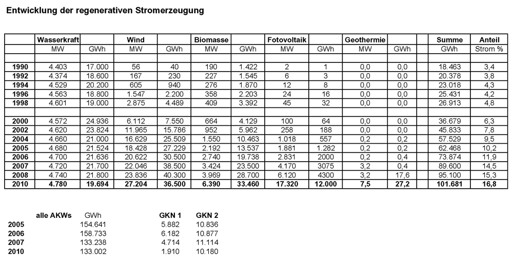 • Tabelle "Entwicklung der regenerativen Stromerzeugung" (zum Vergrößern anklicken)