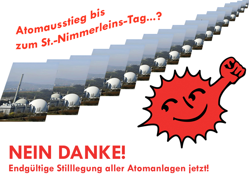 • Alle weiteren Atomkraftwerke sollen eine politische Laufzeitgarantie mit ungestörtem „Normalbetrieb“ von bis zu 12 weiteren Jahren erhalten – mit all den Risiken und Gefahren! Aktuelle Erkenntnisse aus Fukushima sowie Sicherheitsanforderungen nach aktuellem Wissenstand werden ignoriert.
