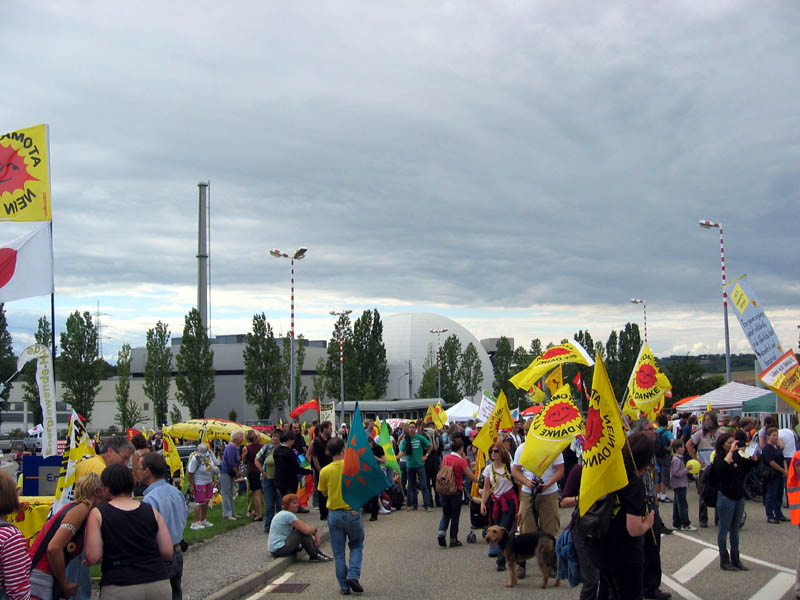 Anders als bisher fand die Kundgebung vor Tor 2 des Atomkraftwerks statt, das dem zweiten Block am nächsten liegt. Dadurch sollte darauf hingewiesen werden, dass GKN Block 2 trotz der Stilllegung von Block 1 weiter in Betrieb ist, weiter strahlt und weiter strahlenden Müll produziert - nach dem Willen der Bundesregierung bis 2022.