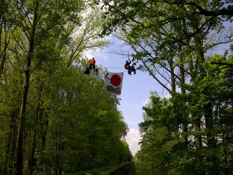 (sofa-ms.de, 07.05.2012) Die bislang längste Luftblockade eines Urantransports ist vorbei - acht Stunden hielt die Bundespolizei den Uranzug zurück. Die heutige Abseilaktion hat eindrucksvoll gezeigt, dass der Widerstand gegen die Urananreicherung in Gronau und die damit verbundenen Urantransporte wächst. Bundes- und Landesregierung müssen endlich aktiv werden und die UAA stilllegen sowie die Urantransporte stoppen.