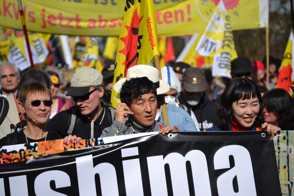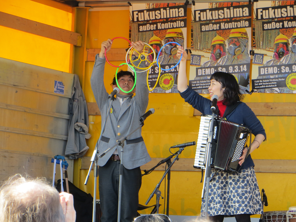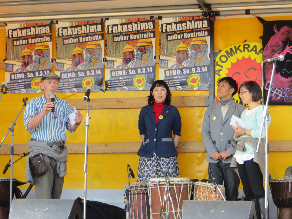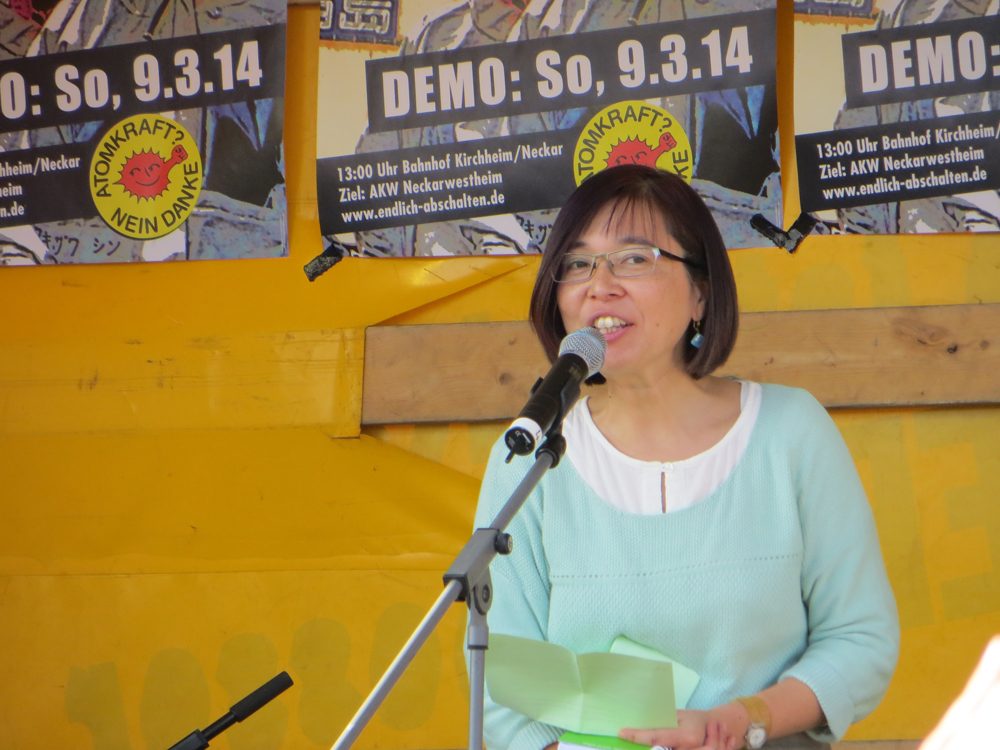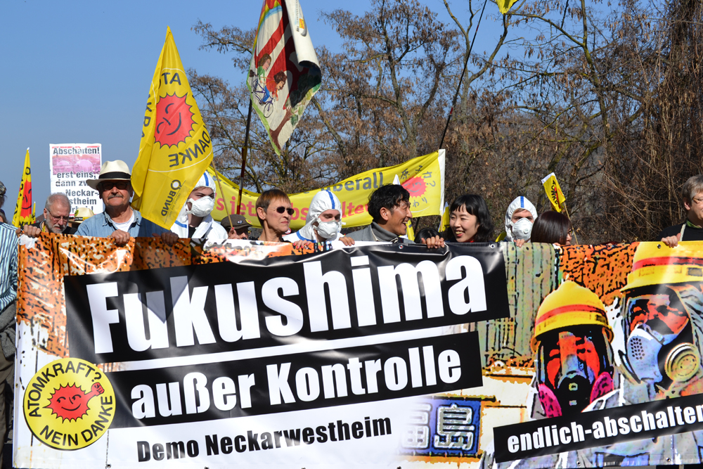 "Fukushima außer Kontrolle". Drei Jahre nach Beginn der Atomkatastrophe in Fukushima demonstrierten mehr als 3000 AKW-GegnerInnen am 09. März in Neckarwestheim für die sofortige Stilllegung aller Atomanlagen - weltweit. Angesichts der nicht beherrschbaren Situation im japanischen Fukushima waren die Berichte der Gäste aus Japan, Mako Oshidori und Prof. Dr. Detlev Schauwecker besonders eindrücklich. In Fukushima zeichnen sich die Schäden, die der dreifache Super-GAU hinterlässt, deutlich ab. Die Anzahl der Krebserkrankungen steigt drastisch. Unterdessen nimmt die Unterdrückung der Pressefreiheit in Sachen Information zu Fukushima und dessen Folgen massiv zu - AKW-Kritiker werden überwacht und diskriminiert.