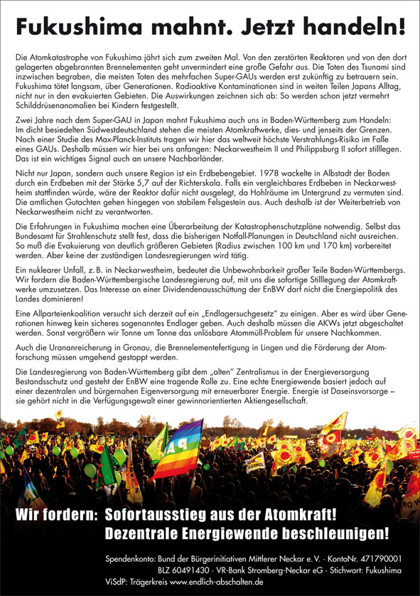 Die Flyer und die Plakate (A0, A2 und A3) für unsere Demonstration am Fukushima-Aktionstag (09.03.13) sind (kostenlos) abholbereit - wir sollten jetzt mit der Mobilisierung für unsere Aktion in Neckarwestheim beginnen.