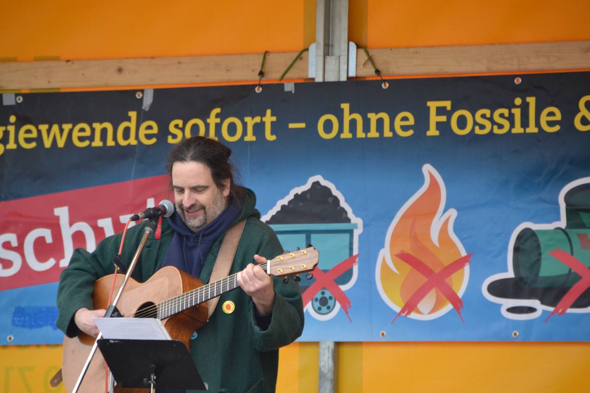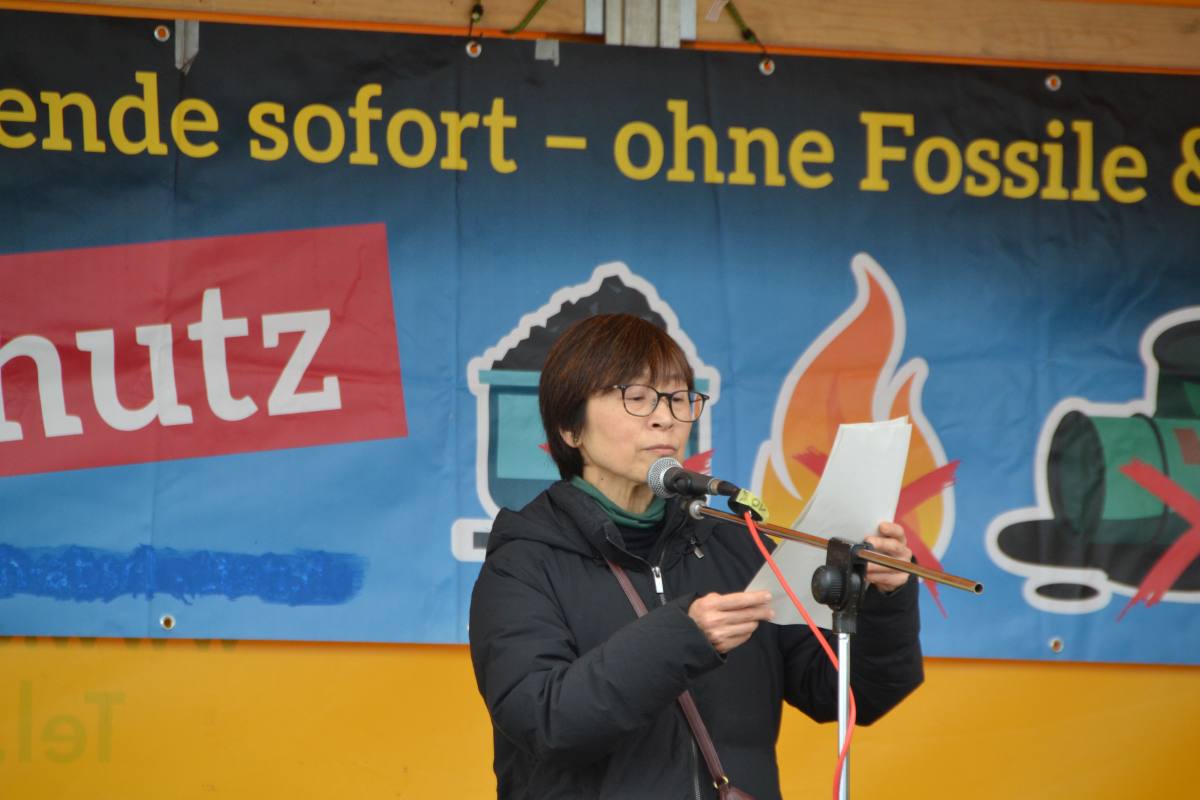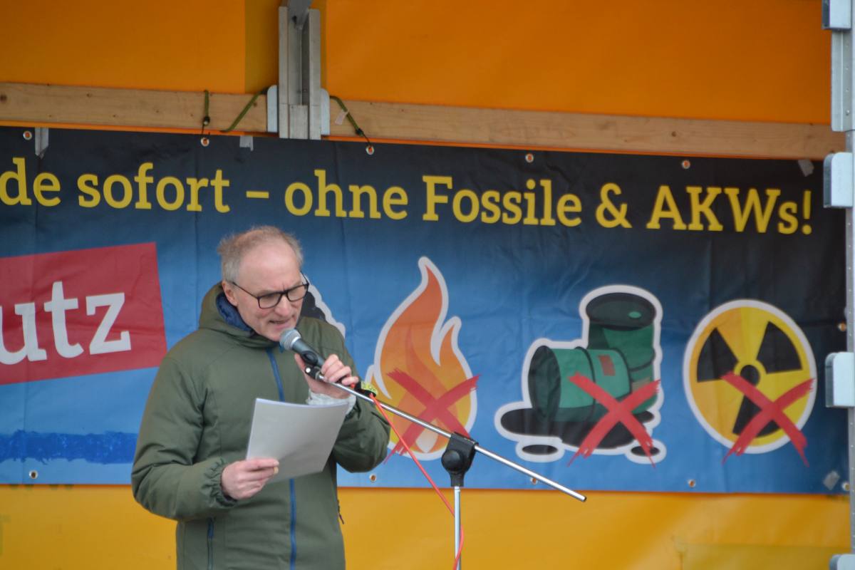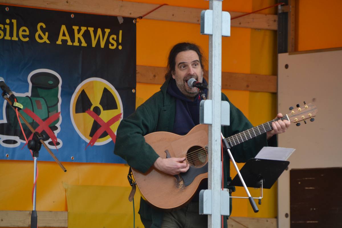 Nagomi Norimatsu, die Mitbegründerin der Stuttgarter Anti-Atom-Gruppe Ichimoku trug die die Solidaritätserklärung aus Japan von "Bye bye Genpatsu Kyioto" vor. Dort versammelten sich zur gleichen Zeit 1.100 Menschen zu einer Anti-Atom-Demo. Jörg Schmid (IPPNW und BBMN) berichtete über die aktuelle Situation in Fukushima. Evelyn Pfister vom AKU Wiesbaden hörten wir zur aktuellen politischen Situation. Sie setzt den aktuellen Rechtsruck, die Migrationspolitik, Klimaveränderungen und die aktuelle Aufrüstungsspirale in einen erschreckend zusammenhängenden Kontext. Herbert Würth vom Aktionsbündnis sprach über den aktuellen Stand der Energiewende in Deutschland und der EU und über die skandalöse Förderung von Atom und Fossilen durch die EU-Taxonomie. Unterstützt wurde die Kundgebung vonSalossi, den viele sicherlich bereits kannten von seinen Auftritten zum Beispiel zusammen mit "Klaus der Geiger" oder "Strom & Wasser".