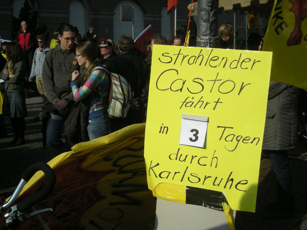 Bunt und lautstark haben heute, am 12. 02 2011 in Karlsruhe mehrere hundert AtomkraftgegnerInnen ihren Unmut über den anstehenden Transport hochradioaktiven Materials aus Karlsruhe nach Lubmin geäußert.