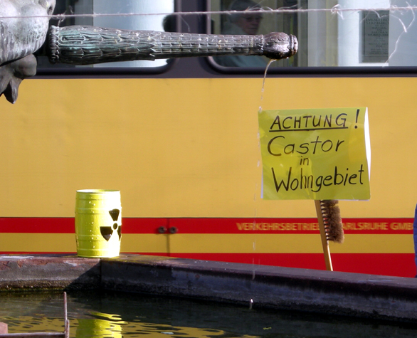 Nach Abschluss der Kundgebung fanden in der Karlsruher Innenstadt mehrere Aktionen der AtomkraftgegnerInnen statt. Unter anderem wurden die Straßenbahnschienen vom Strahlendreck gereinigt, die Wohnhäuser entlang der Transportstrecke auf Strahlenexposition hin untersucht und Fahrgäste dekontaminiert.