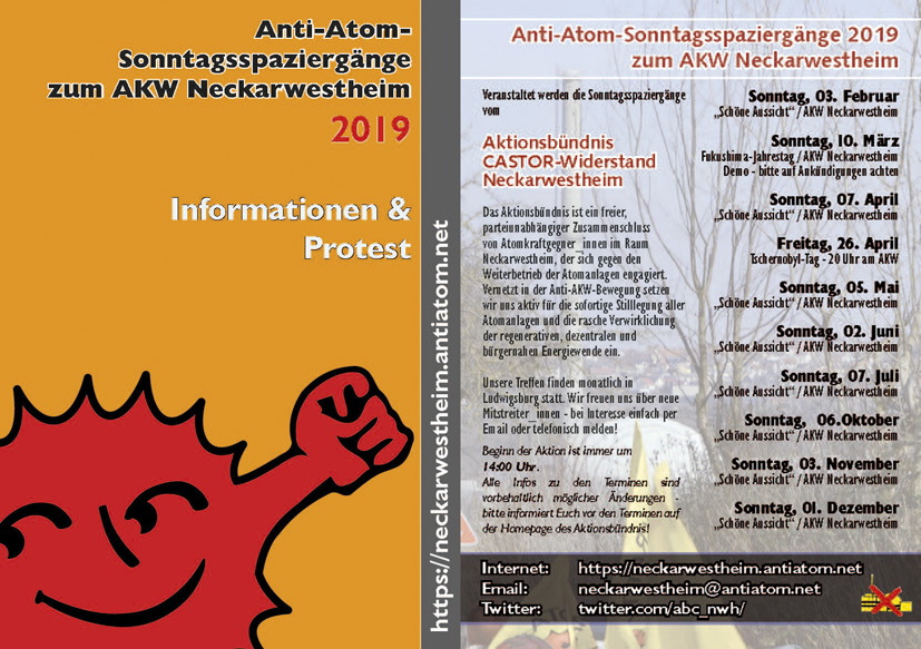 b_215_215_16777215_0_0_images_stories_akt18_Karte-Sonntagsspaziergang2019.jpgImmer wieder Sonntags lädt das Aktionsbündnis Castor-Widerstand Neckarwestheim zu Protest und Information ans AKW Neckarwestheim ein. Auch im Jahr 2019 finden die Anti-Atom-Spaziergänge meistens am ersten Sonntag des Monats statt. Das Thema (und ggf. den Ort) des Sonntagsspazierganges geben wir immer ungefähr zwei Wochen vorher auf unserer Internetseite und auf Flyern bekannt.