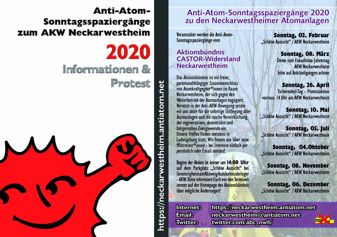 Immer wieder Sonntags lädt das Aktionsbündnis Castor-Widerstand Neckarwestheim zu Protest und Information ans AKW Neckarwestheim ein. Auch im Jahr 2020 finden die Anti-Atom-Spaziergänge meistens am ersten Sonntag des Monats statt. Das Thema (und ggf. den Ort) des Sonntagsspazierganges geben wir immer ungefähr zwei Wochen vorher auf unserer Internetseite und auf Flyern bekannt.